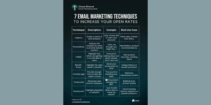 7 email marketing techniques to increase open rates. Handy infographic breaks down strategies like urgency, FOMO, personalization, and more, so your email subject lines actually get noticed.