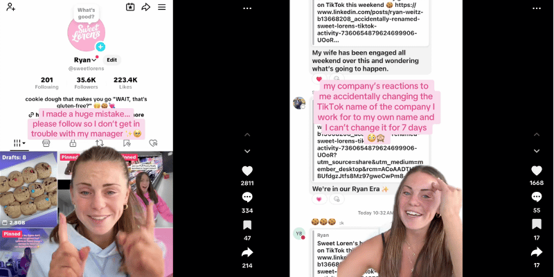 Cookie brand turns social media mistake into a viral win. A new social media manager accidentally renamed Sweet Loren's TikTok, but instead of a disaster, the brand ran with it, posting 42 videos, racking up 2.2M+ views, and boosting sales by 46%.